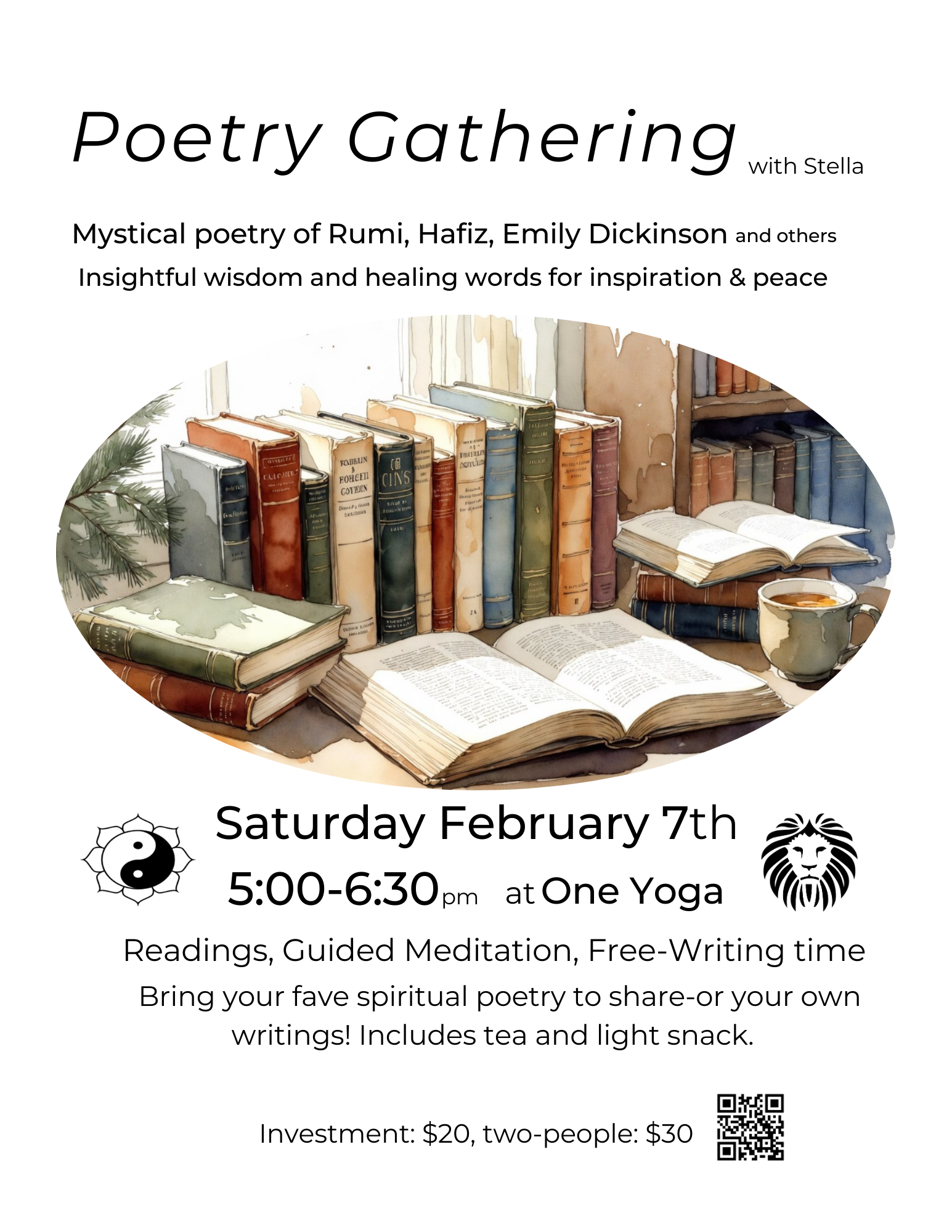 Step into a warm, inviting space for poetry and reflection. This one-hour gathering with Stella offers a lighthearted yet meaningful atmosphere to share words, explore creativity, and connect with others over tea and snacks.