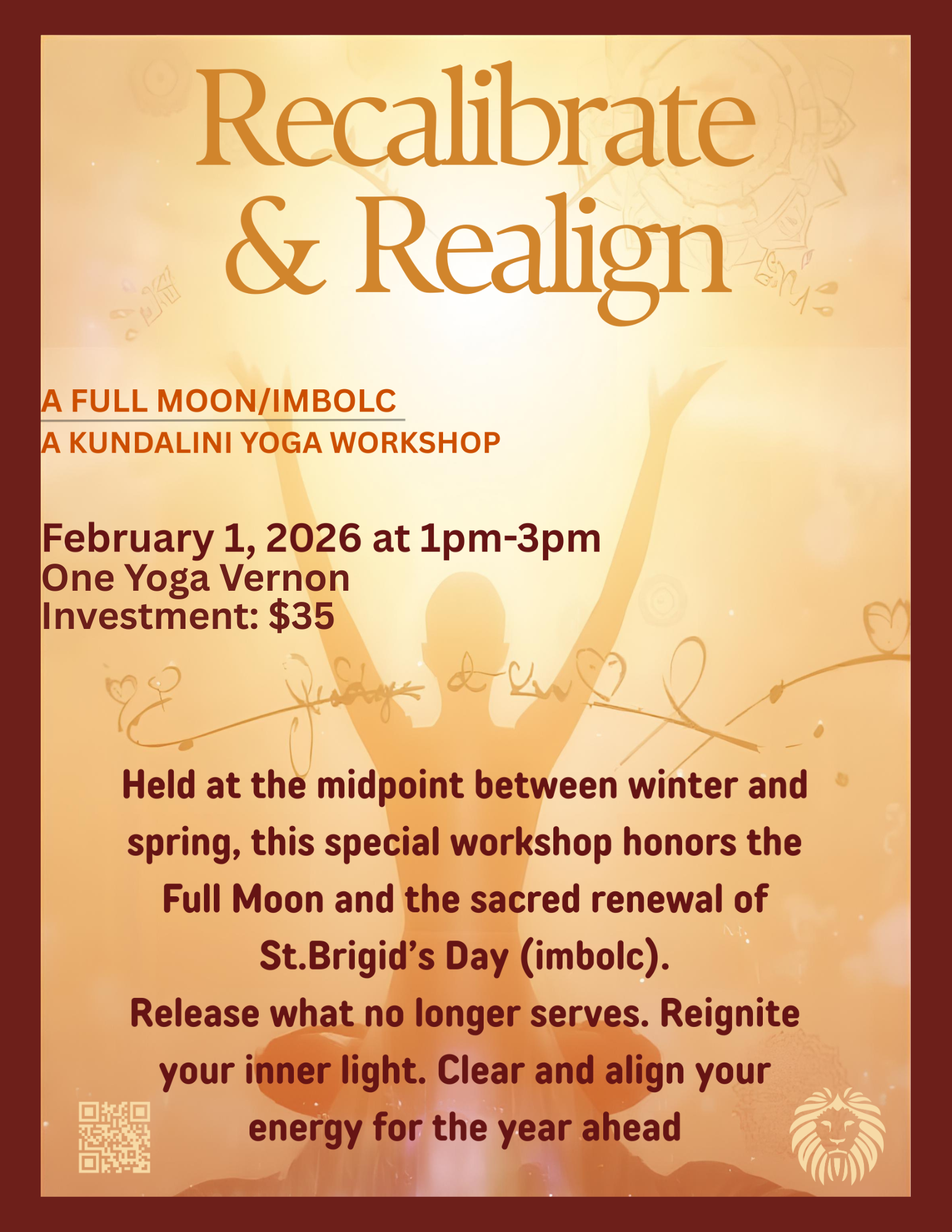 Join Ashley for a soul-nourishing Kundalini Yoga experience held at the sacred midpoint between winter and spring. Guided by the illuminating energy of the Full Moon and the renewing spirit of St. Brigid’s Day (IMBOLC), this workshop invites deep reflection, release, and renewal.